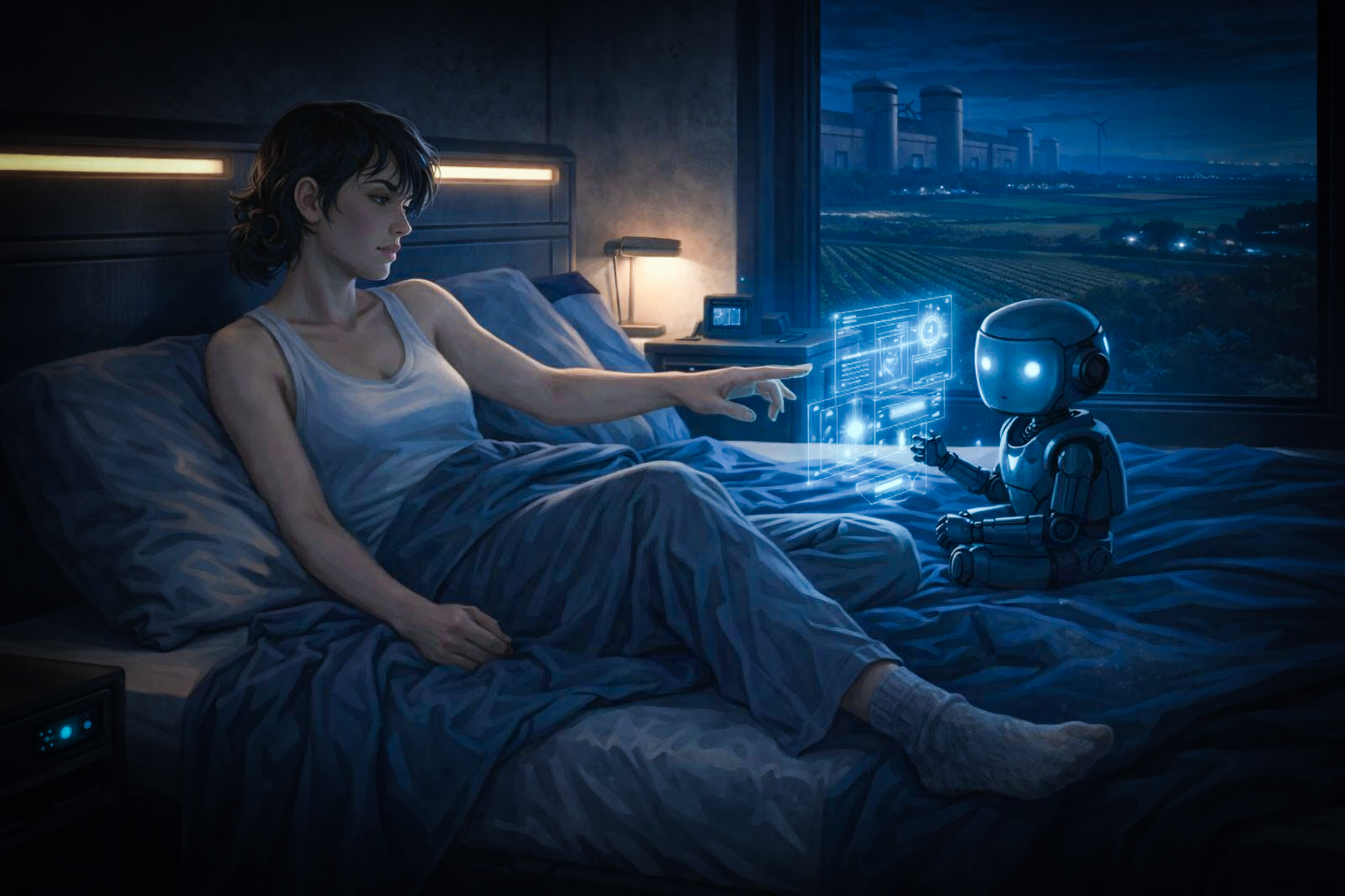 Le bâtiment est calme la nuit. Seuls les robots continuent de travailler, leurs articulations cliquetant dans le silence, rassurant les habitants. Rien ne me saute aux yeux, il faut dire que je ne suis pas très réveillée.