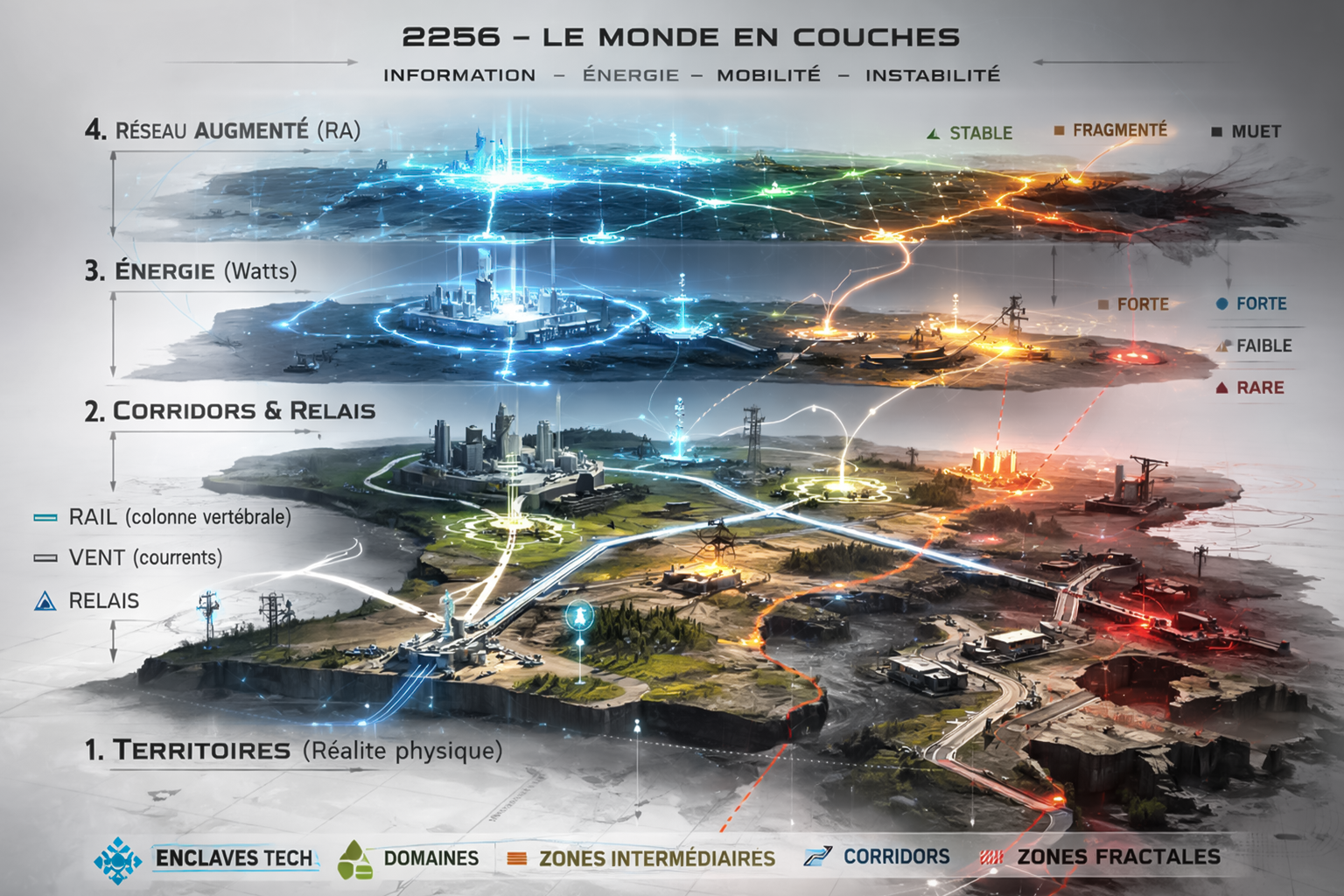 Pour comprendre ce monde, il faut penser en couches : enclaves (stables, contrôlées), intermédiaires (ruraux, organisés, exposés), corridors (rail, vent, relais), zones fractales (instables, dangereuses, mouvantes).